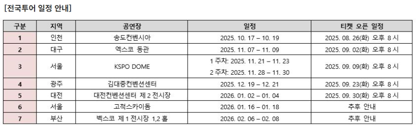 | 서울 | KSPO DOME (올림픽 체조경기장) | 2025-11-28 ~ 2025-11-30 | 19:00 |